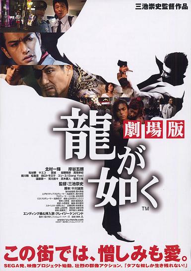 Ryū ga gotoku – Gekijō-ban (龍が如くー劇場版, Yakuza Like a Dragon). Regia: Miike Takashi. Sceneggiatura: Togawa Seiji. Fotografia: Yamamoto Hideo. Montaggio: Shimamura Yasushi. Musica: Endō Kōji. Suono: Shibazaki Kenji. Interpreti e personaggi: Kitamura Kazuki (Kazuma Kiryū), Kishitani Gorō (Majima Gorō), Natsuo (Haruka, la ragazzina), Saeko (Yūi), Shoya Shun (Satoru), Aikawa Shō (il detective Noguchi), Arakawa Yoshiyoshi, (Beam, il trafficante d’armi), Endō Ken’ichi (Imanishi), Gong Yoo (Park, il killer), Katō Haruhiko (Kazuki), Claude Maki (Nishikiyama Akira), Matsushige Yutaka (Date, il detective), Tomorowo Taguchi. Produzione: Nagoshi Toshihiro, Umemura Munehiro per Sega Corporation ArtPort, CJ Entertainment. Distribuzione: Tōei. Durata: 110’. Prima proiezione in Giappone: 3 marzo 2007.